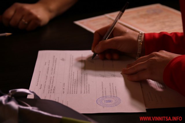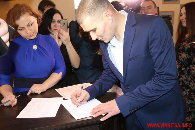 У Вінниці на День закоханих у башті, що на Європейській площі, розписатися вирішили шість пар. Серед них 24-річні Дмитро та Антоніна, які тапер вже носять спільне прізвище Ланецькі. Молодята взяли участь у пілотному проекті «Шлюб за добу», який стартував у кількох містах України.
