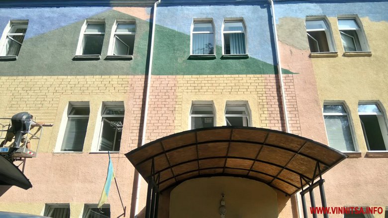 З самого ранку 27 серпня художник Володимир Ходaк працює над створенням нового стінопису у Вінниці. Вже видні контури майбутнього будинку зі старовинними вікнами та балконом, митець наносить зображення цегли.