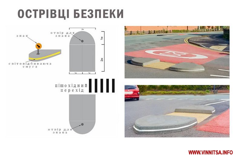 «Острівці безпеки єдиного стандарту плануємо встановлювати у Вінниці. На разі розглядаємо два типи конструкцій модульного типу. Один з них – з бетонних деталей, інший – з полімерно-піщаних. Їх легко збирати/розбирати, а матеріали, з яких виготовлені, є стійкими до корозії та мають гідрофобні властивості. Окрім того, на основу острівця нанесена світловідбивна смуга. Таким чином, впізнаваний об’єкт буде привертати увагу учасників руху, і це сприятиме покращенню ситуації на дорогах міста.