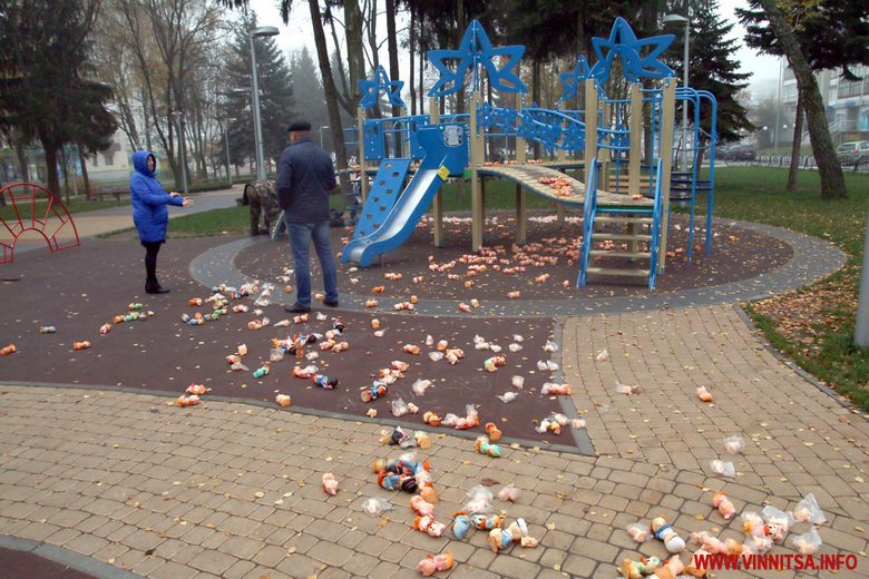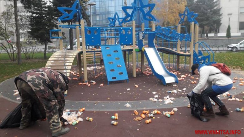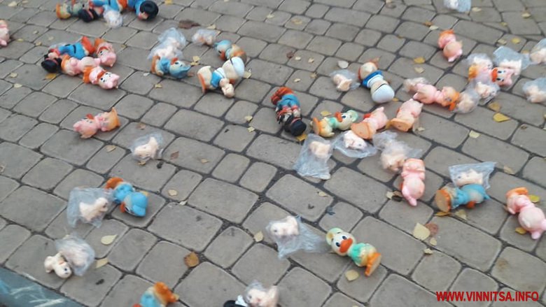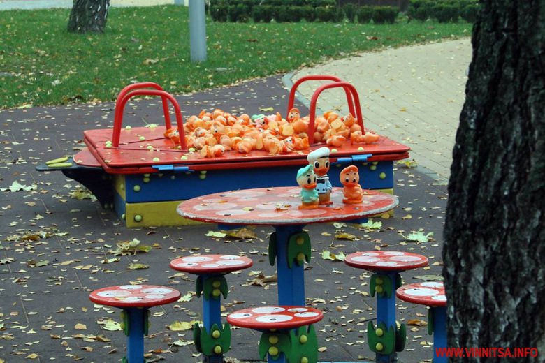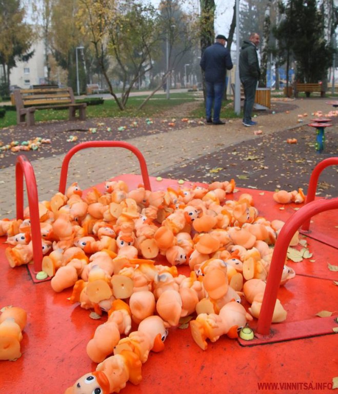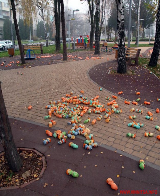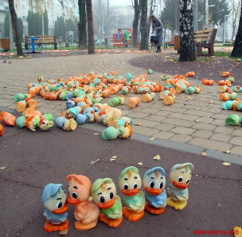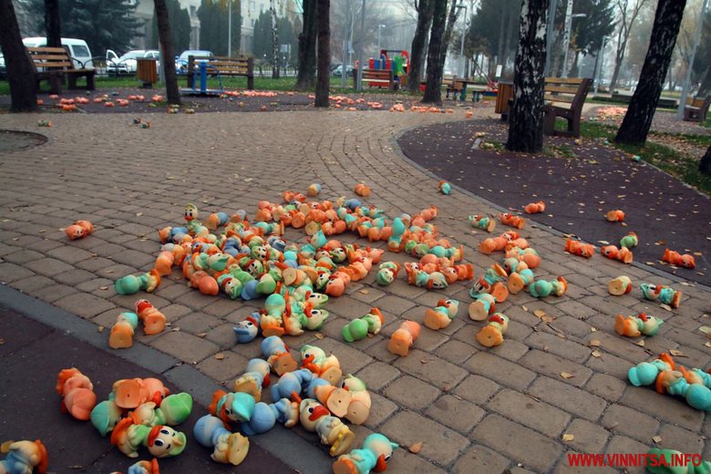5 листопада, вранці, вінничани були здивовані «знахідкою» - тисячі гумових іграшок каченят розкидані біля дитячого майданчика на проспекті Космонавтів. З самого ранку двірники збирали іграшки та зателефонували правоохоронцям, аби з’ясувати, хто це зробив і чи безпечні іграшки.