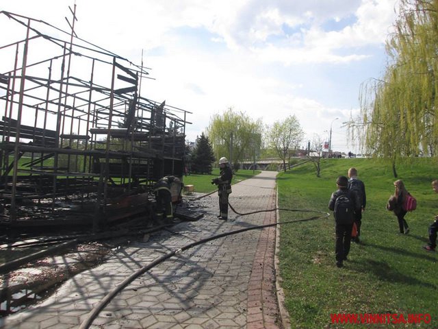 11 квітня у Вінниці на набережній «Рошен» згорів атракціон, для розваги дітей «Корабель». Рятувальники гасили полум’я, щоб не допустити поширення вогню на об’єкти, що поруч.