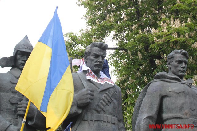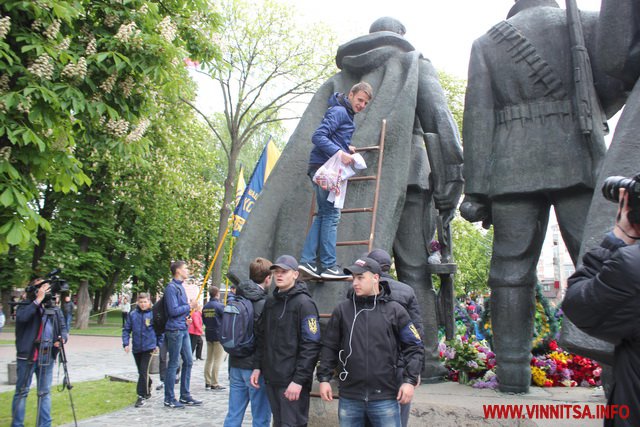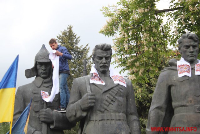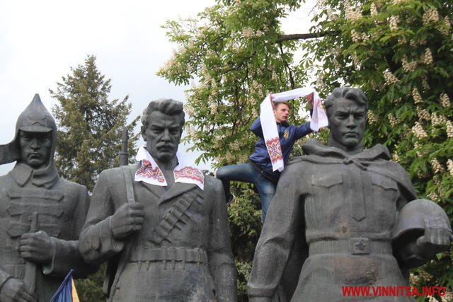 9 травня у Вінниці під час Дня перемоги молоді люди влаштували акцію вшанування вінничан, які загинули у період Другої Світової війни. Завдяки драбині вони залізли на пам’ятник Невідомим солдатам, що на Меморіалі Слави на площі Європейська. На плечі трьом бійцям накинули рушники з національною українською символікою.
