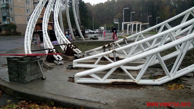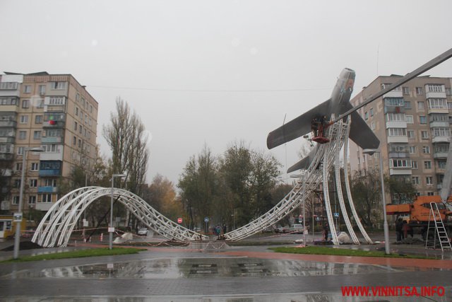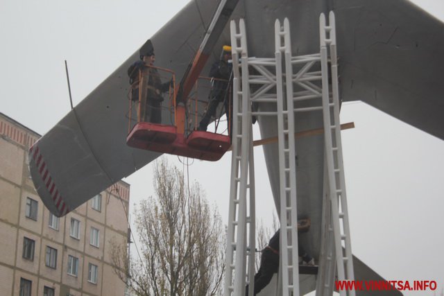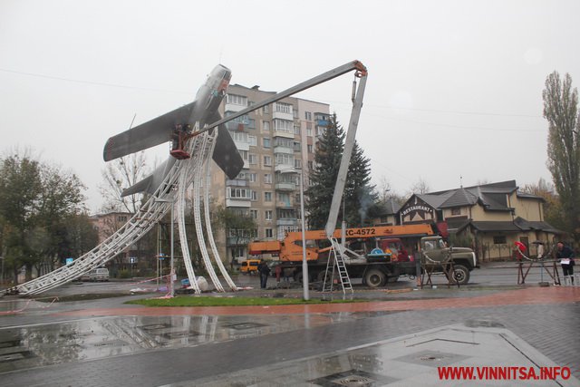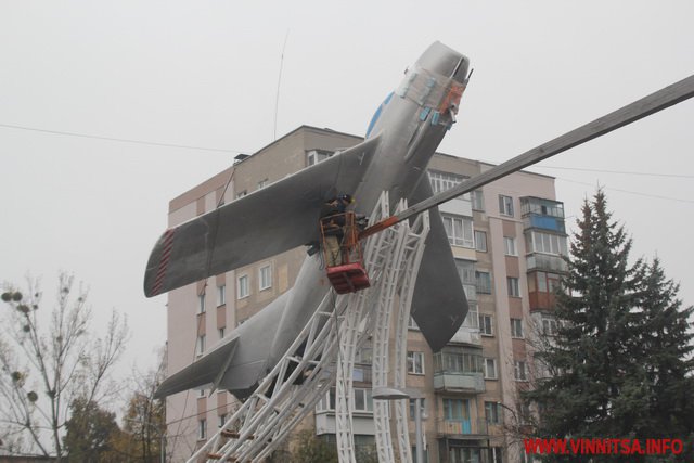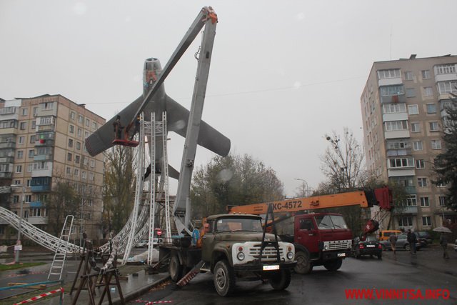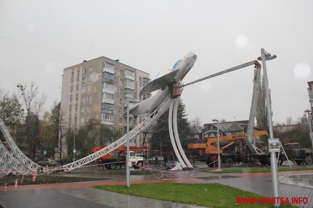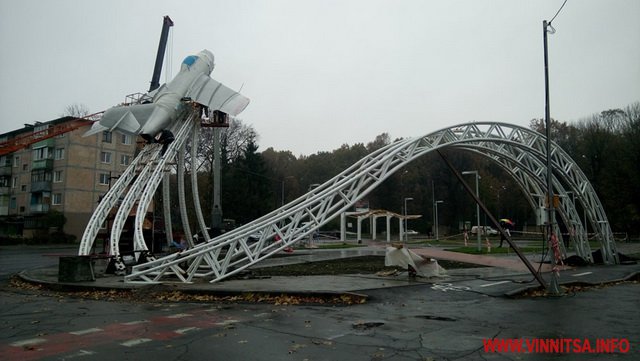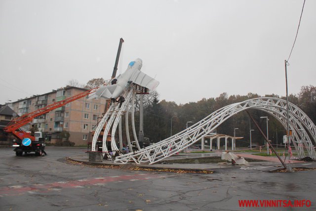 Вранці 26 жовтня у Вінниці на площі Костянтина Могилка почали монтаж літака «Міг-15». Літак закріплюють на верхній точці металевої конструкції, яка за задумами архітекторів імітує слід від польоту.