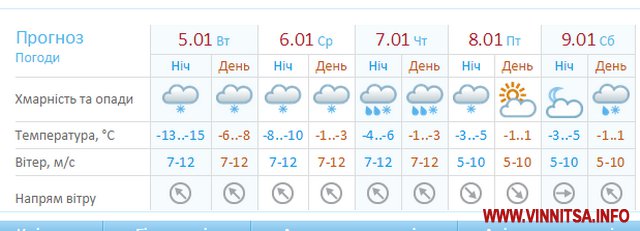За прогнозом Гідрометцентру, Святвечір і Різдво у вінничан будуть сніжними. Опади передбачають 5,6,7 і 9 січня. Вітер швидкістю від 5 до 12 метрів на секунду.