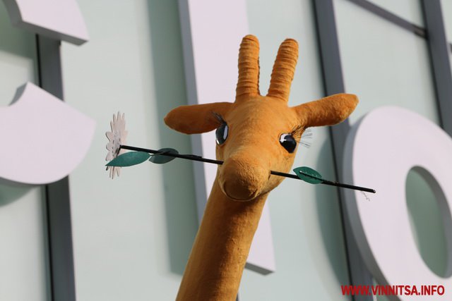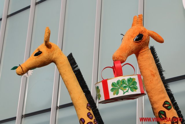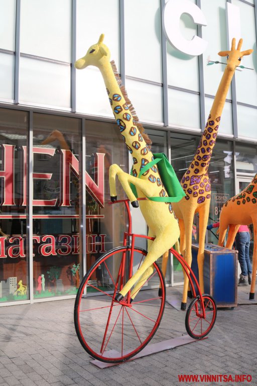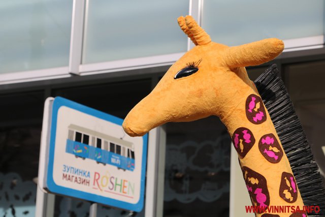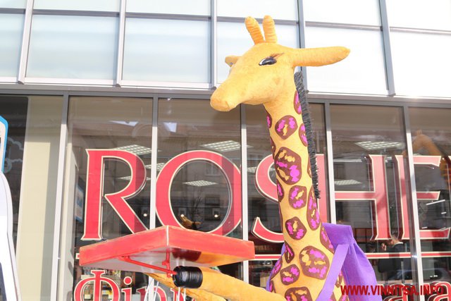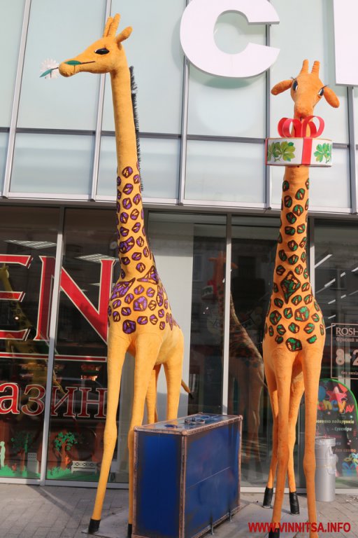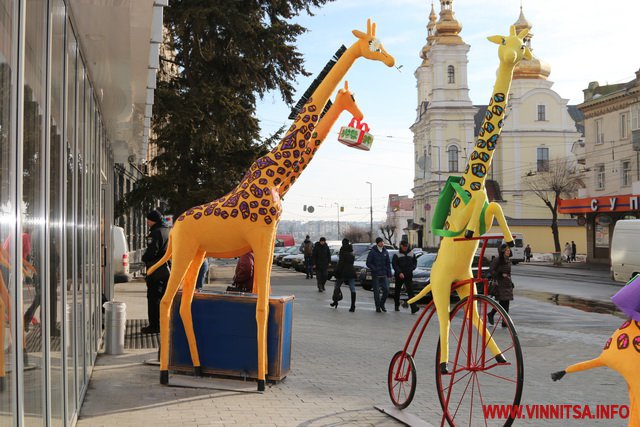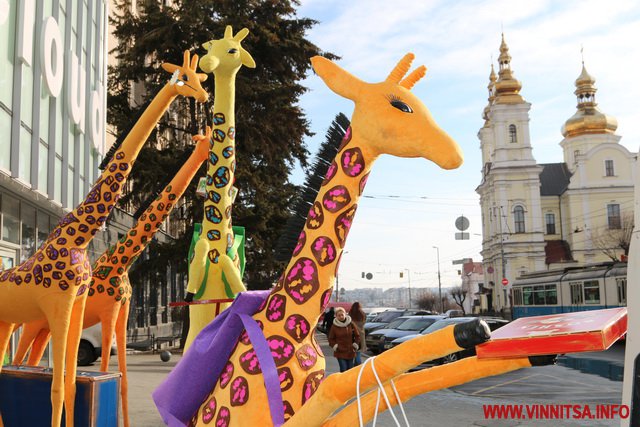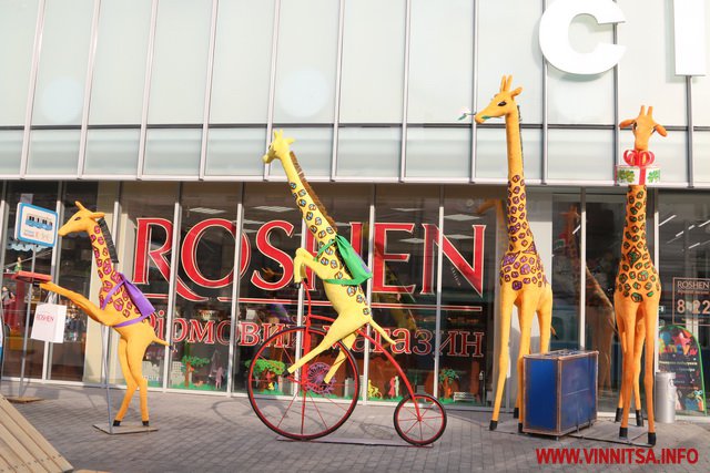 У Вінниці на Соборній біля магазину «Рошен» змінили декорації – замість зимових пінгвінів, встановили чотирьох велетенських жирафів.