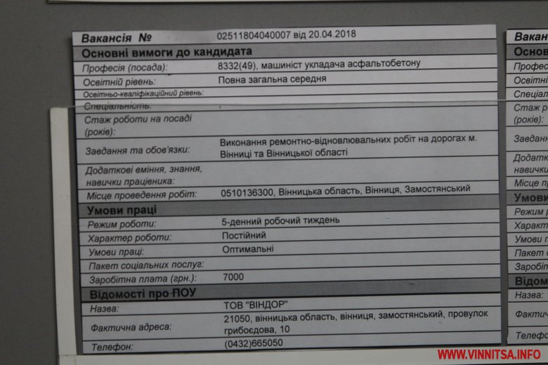 Військова частина 3008 Національної гвардії України шукає стрільця та водія транспортних засобів. В ПАТ «Вінницяобленерго» потрібні водії і електромонтери. ТОВ Вінницький комбінат хлібопродуктів в пошуках начальника елеватора, слюсара, вантажника, начальника охорони. ДУ «Стрижавська виправна колонія» шукає лікаря офтальмолога, хірурга, молодшого інспектора. В МК «Жек №7» потрібен електрозварювальник, прибиральниця та слюсар-сантехнік. На підприємство «Електричні системи» потрібні в’язальники схемних джгутів кабелів і шнурів.