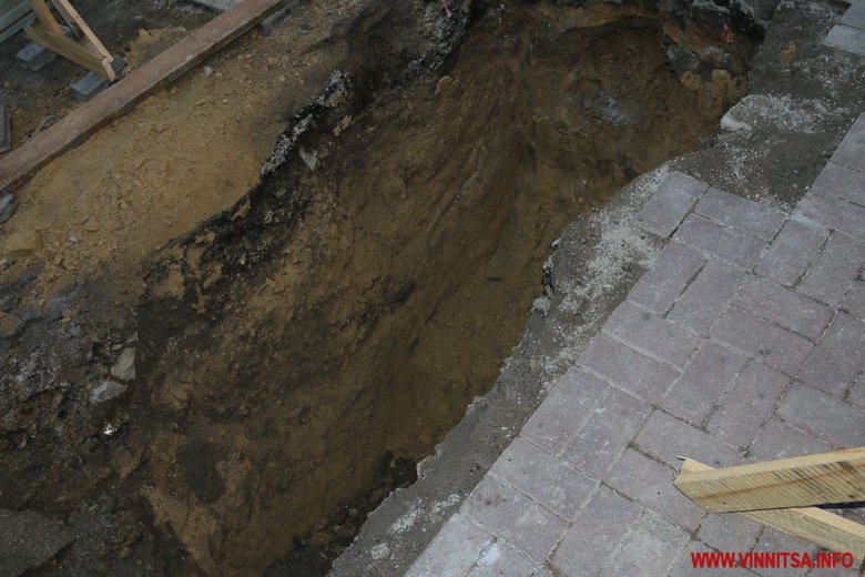 У Вінниці по вулиці Миколи Оводова проводяться будівельно-монтажні роботи. Навпроти входу до ТЦ Sky Park робітники демонтували частину тротуарної плитки, за допомогою спецтехніки вирили яму.