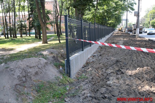 У Вінниці продовжують зводити огорожу навколо центрального парку. Там де, вже її зробили зі сторони вулиці Магістратської знімають асфальтне покриття.