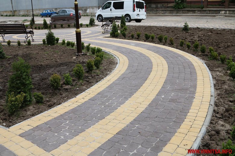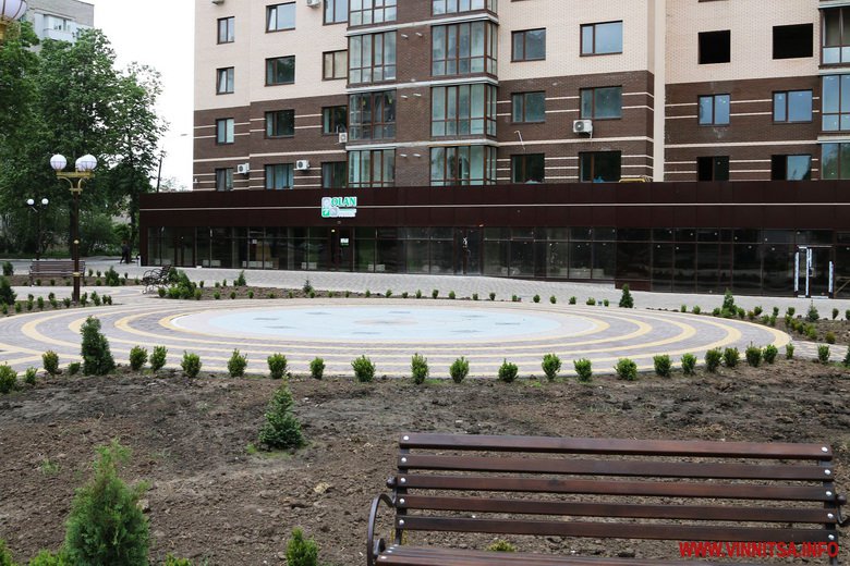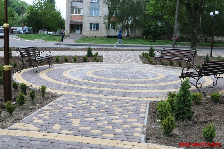 Територію навколо фонтану виклали плиткою. Поставили лавочки і ліхтарі.