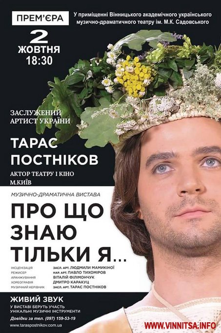 2 жовтня у Вінниці відбудеться прем’єра музично-драматичної вистави «Про що знаю тільки я». Ідея вистави належить актору театру і кіно, Заслуженому артисту України Тарасу Постнікову. Ннад втіленням цього проекту також працювала ціла команда професіоналів. Тарас грає у цій виставі всі ролі, всіх найрізноманітніших персонажів. У моновиставі показане загадкове, різноманітне та непросте життя українських кобзарів та лірників, а також період гоніння на них, та майже цілковитого знищення.