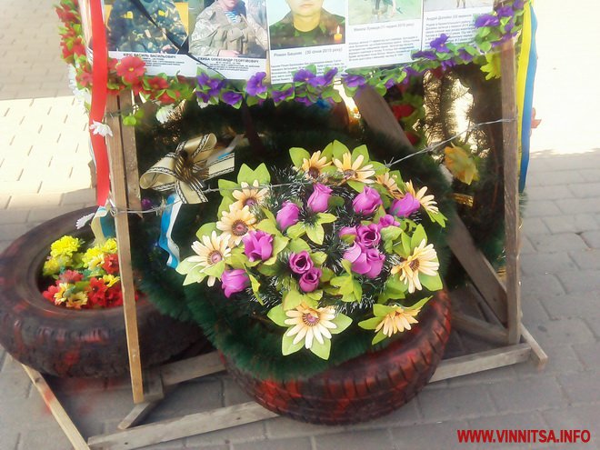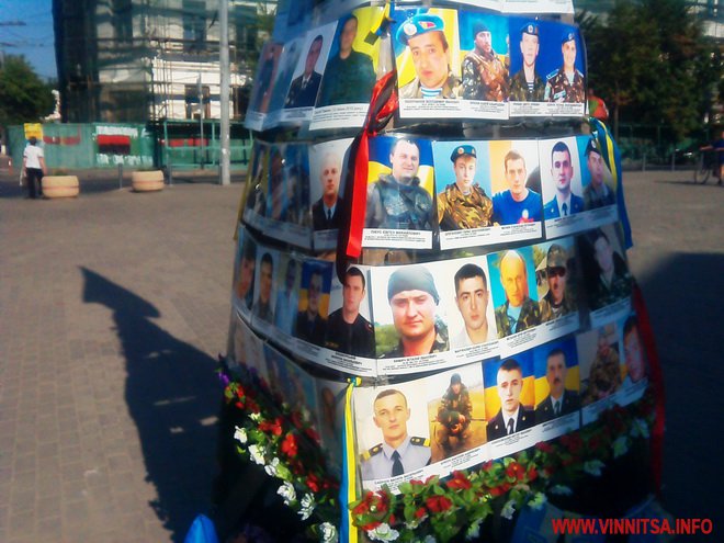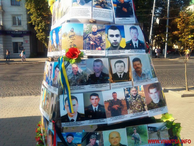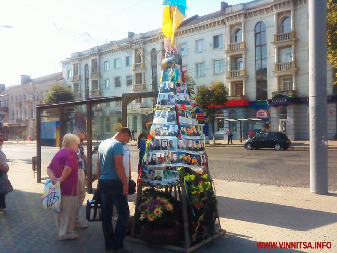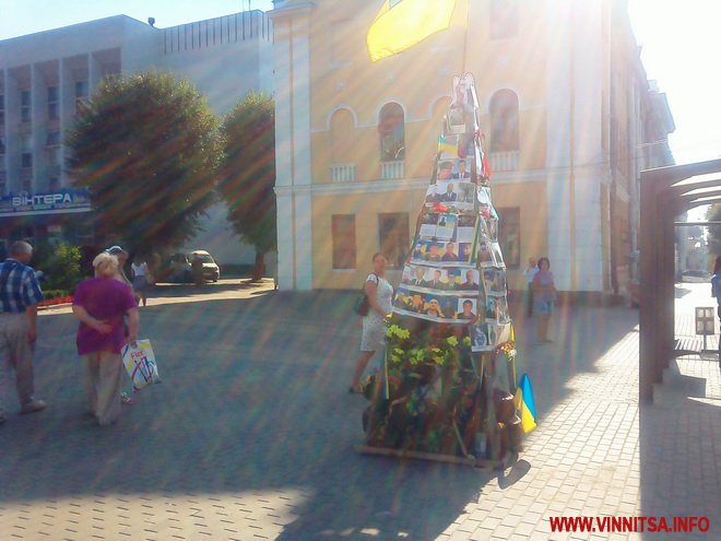 Проте пізнього вечора «йолка» знову опинилася на своєму місці, змінивши вигляд. Її оновили світлинами Героїв, що полягли за Україну в останні місяці неоголошеної війни. Портрети загиблих вінничан-визволителів тепер однакового розміру і заламіновані, аби краще переносити погодні умови.