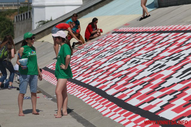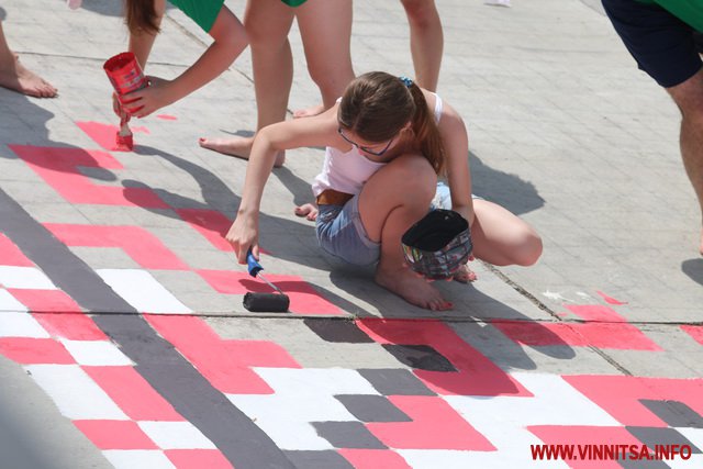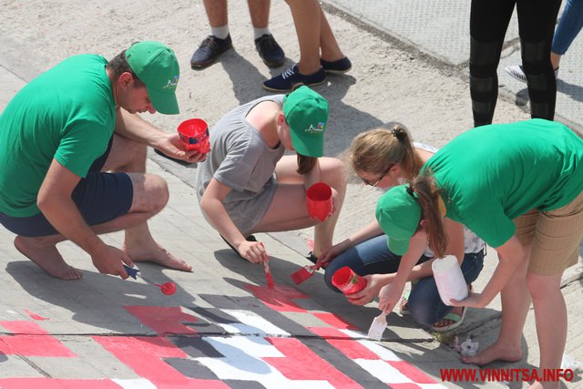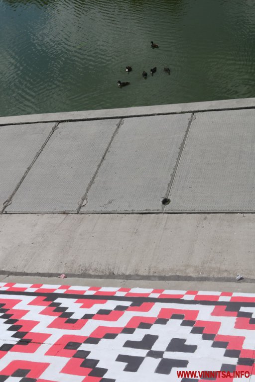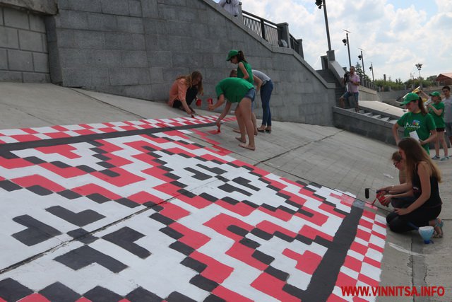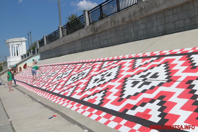 «Це не подільська вишиванка, це трохи видозмінена наша вінницька. Спочатку малюнок ми відновили по тих самих кольорах, що були минулого року. В цьому році вишивку ми зробимо довшою. Хлопці зараз розміткою ділять територію на квадратики 15 на 15 сантиметрів і потім ми продовжимо по них малювати. Є бажання розмалювати всю набережну, але все залежить від фінансування», - каже Дмитро.