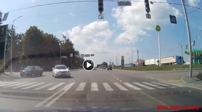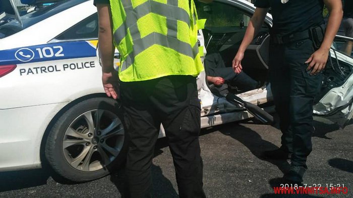 Водій «КІА» їхав з Вінниці на зелене світло світлофора в напрямку Хмельницького. Перед ним на світлофорі з правої сторони смуги зустрічного руху патрульні виконали маневр повороту. Внаслідок ДТП травмовано поліцейського, який їхав на пасажирському сидінні.