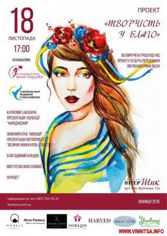 «Гроші, які зберемо, ми одразу передамо батькам дівчинки. До слова, її мама готує для гостей дуже смачне печиво. Ним буде пригощати небайдужих, які зберуться задля порятунку її донечки. Так, як наш захід називається «Творчість у Благо», то звичайно творчі вінничани представлять свої таланти глядачам. Буде і легендарна фотовиставка «Величні жінки крізь століття», у якому взяли участь вінничанки. Також пропонуємо фен-показ нашої дизайнери Катерини Лукашик, вона не лише покаже нову колекцію «Народження», а й продасть з аукціону картину, яку сама намалювала на День Вінниці. За розважальну програму відповідає співачка Оксана Славна. Вона, до речі, презентуватиме нову пісню», - зауважила ще один організатор Людмила Станіславенко.