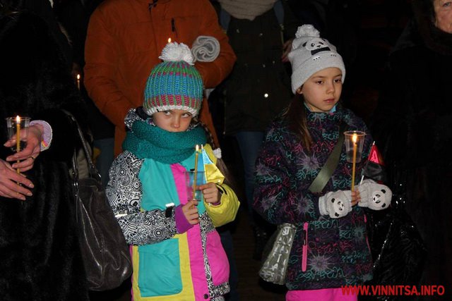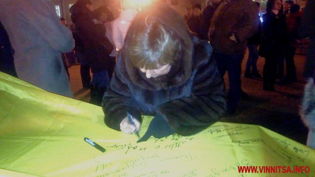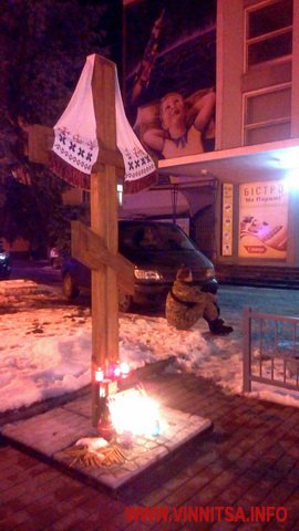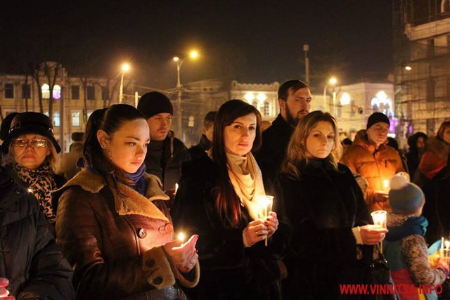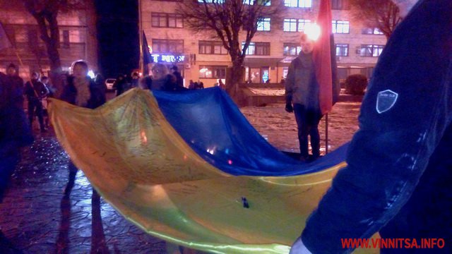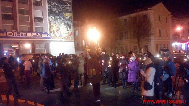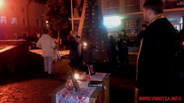 Ввечері 22 грудня на площі Небесної Cотні близько сотні вінничан yа сходинках розклали 14 портретів загиблих бійців. Біля кожного запалена лампадка та квіти.