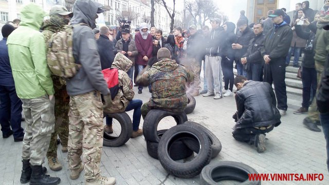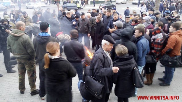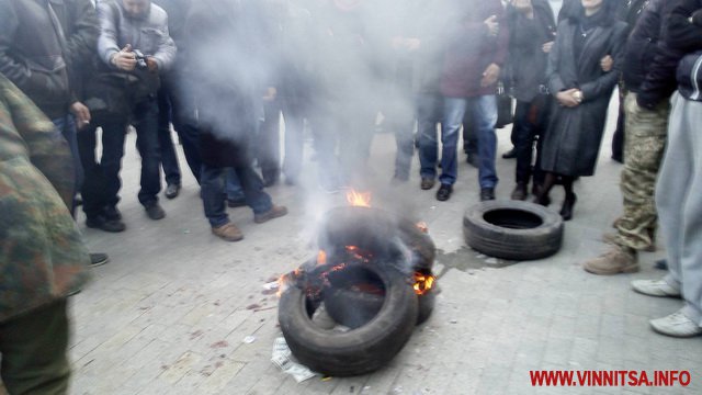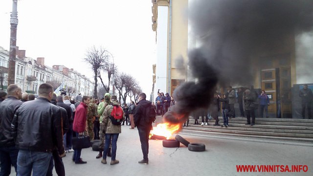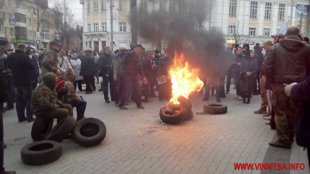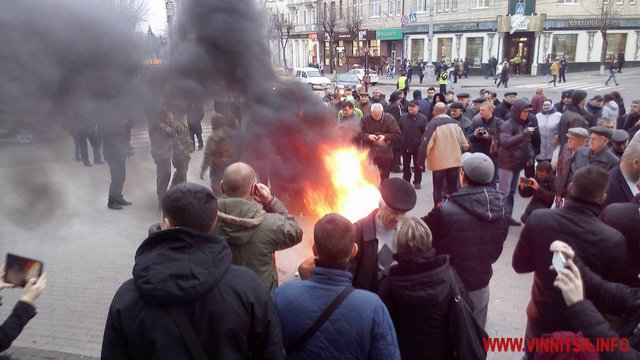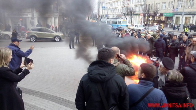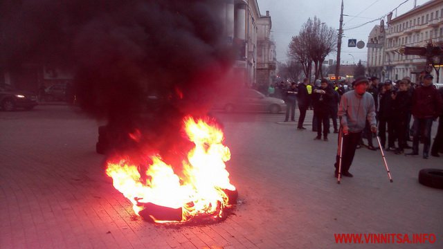 15 березня о 17.45 годині, під Вінницькою облрадою запалили шини. Це наступний крок активістів, після блокади руху громадського транспорту. Шини підпалили після того, як о 17.00 не зібрався кворум депутатів, щоб прийняти звернення. Зареєструвалось 38 депутатів.