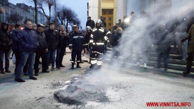 Станом на 18.20 годину до протестувальників підійшов начальник ГУ Нацполіції у Вінницькій області Юрій Педос та попросив не палити шин, бо від їдкого диму перехожим може бути недобре. Шини загасили рятувальники. Протестувальники разом з ним пішли на переговори до голови облради.