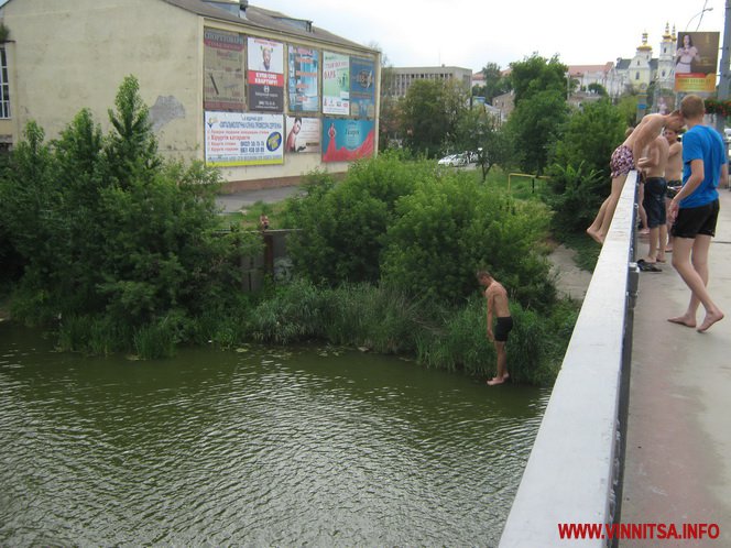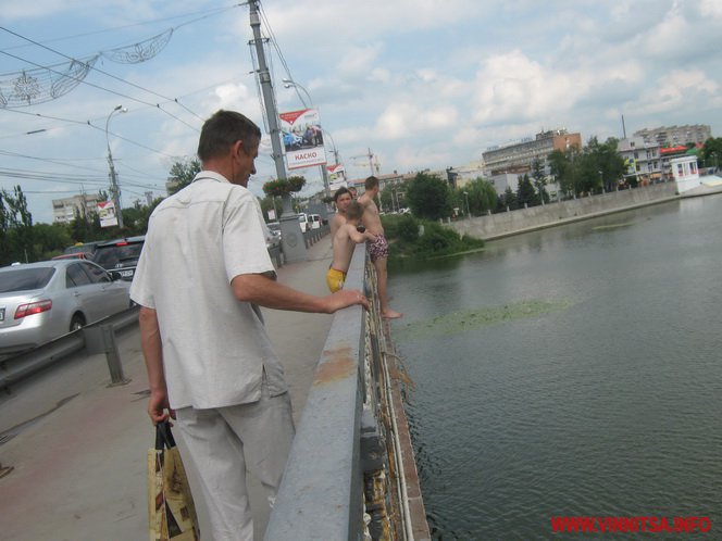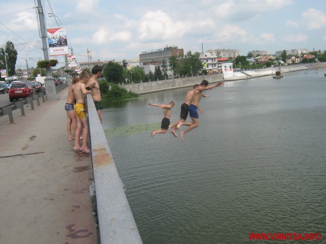 У спеку на центральному мості у Вінниці аншлаг – школярі вилазять на огорожу та стрибають у Південний Буг. Поруч встановлено знаки для катерів та лодок, які вказують на заборону запливати на глибину, проте, як ВІННИЦЯ.info зазначають рятувальники, місцевих хлопців попередження не зупиняють.