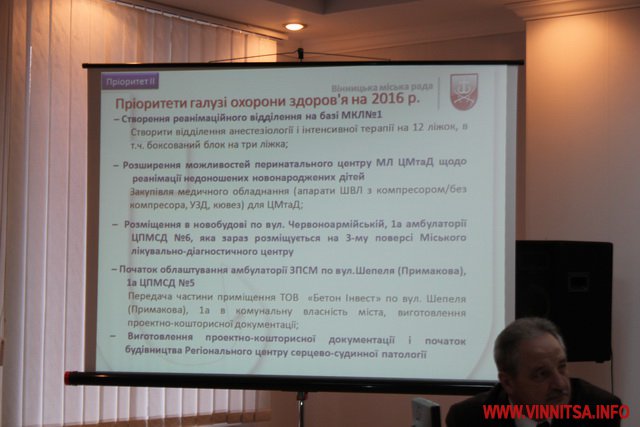 У 2016 році у Вінниці планують створити відділення анестезіології і інтенсивної терапії в лікарні № 1, закупити медичне обладнання для недоношених дітей, облаштувати амбулаторії та розпочати будівництво Регіонального центру серцево-судинної патології.