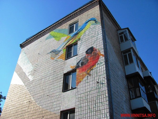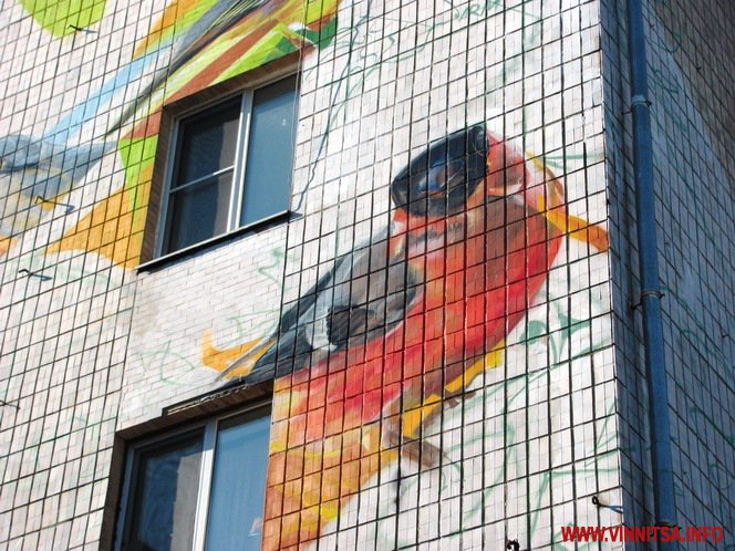 На фасад висотки спершу нанесли контури зображення. Сьогодні там вже красуються три кольорових птахи. Квітів ще не малювали.