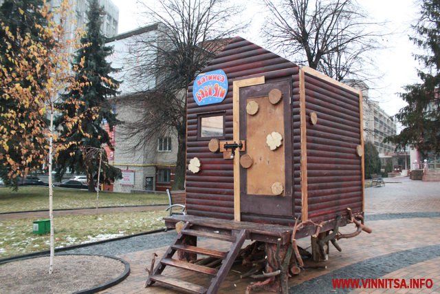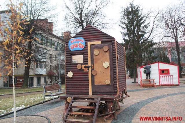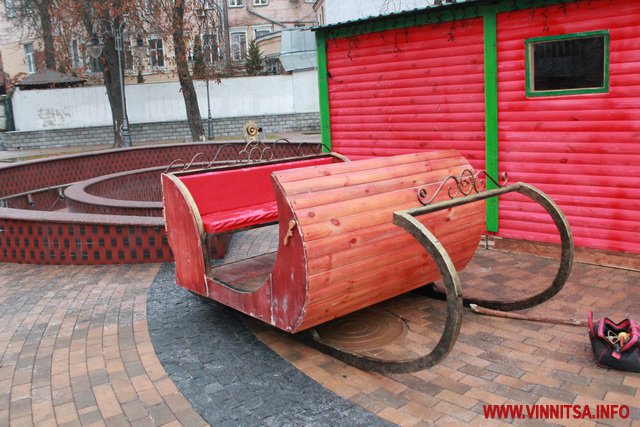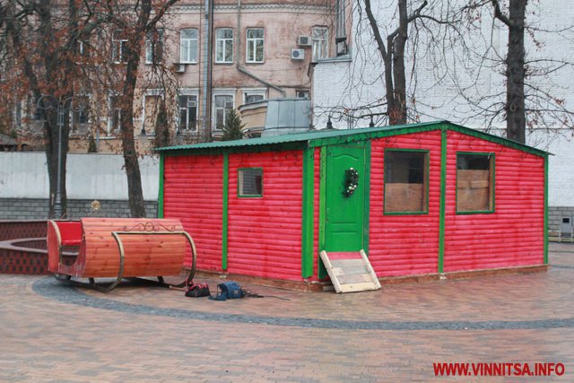 Комунальники вже зібрали хатинку Діда Мороза і Баби Яги та привезли санчата для казкових персонажів. Все це декорують гірляндами.