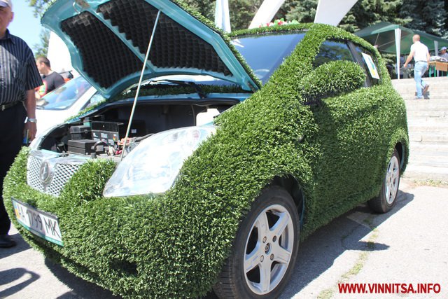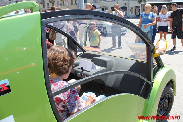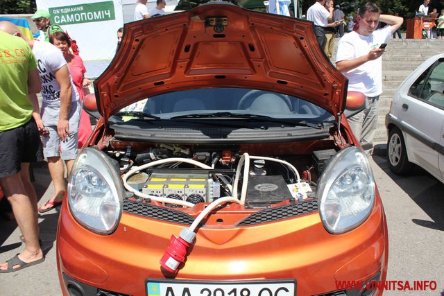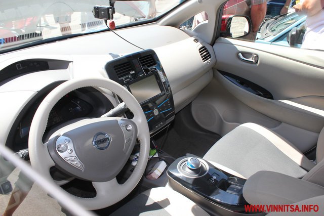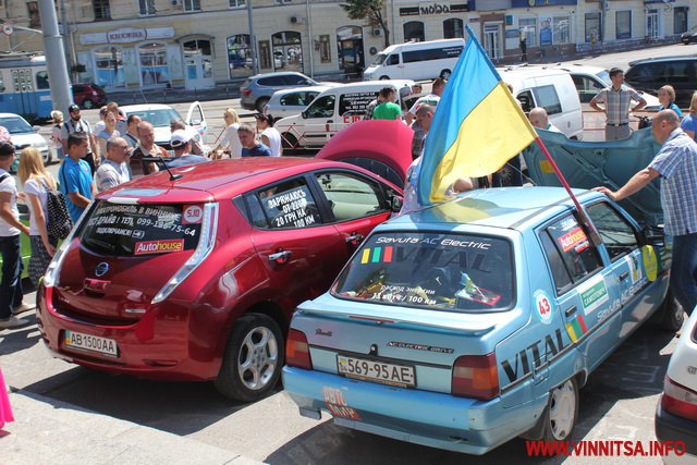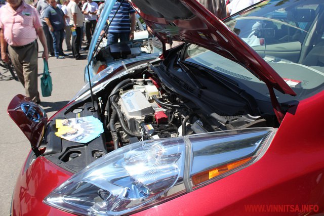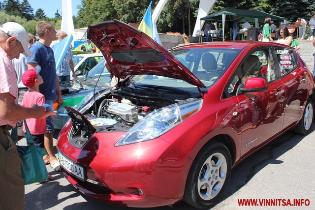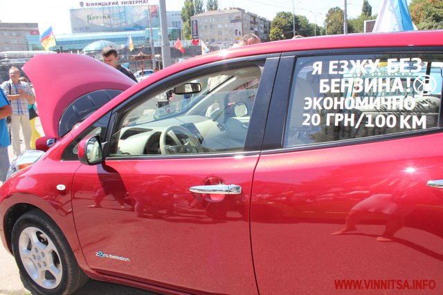 Представлені були і автомобілі серійного виробництва такі як Nissan Leaf. Власник цієї автівки зробив на склі наліпку: «Я езжу без бензина».