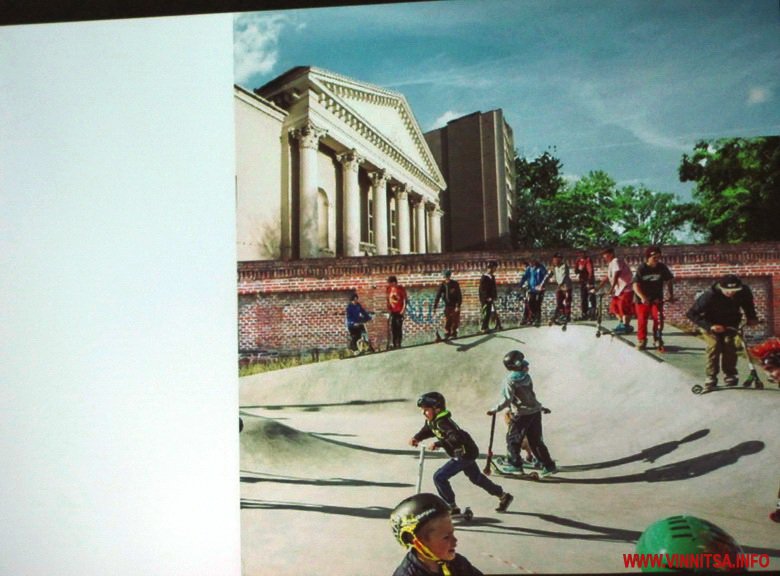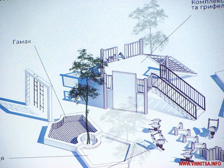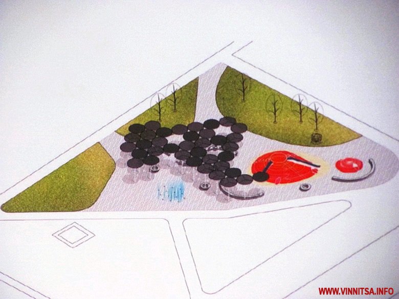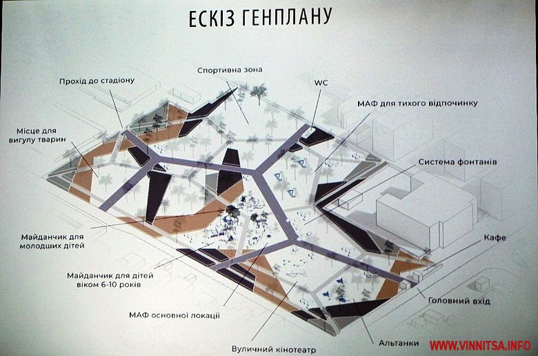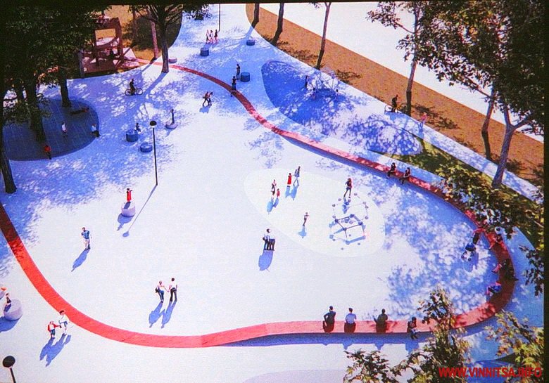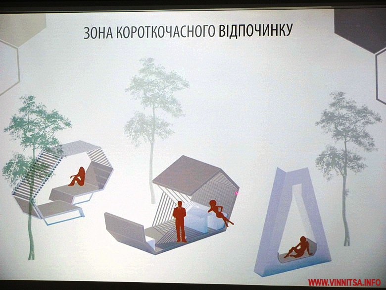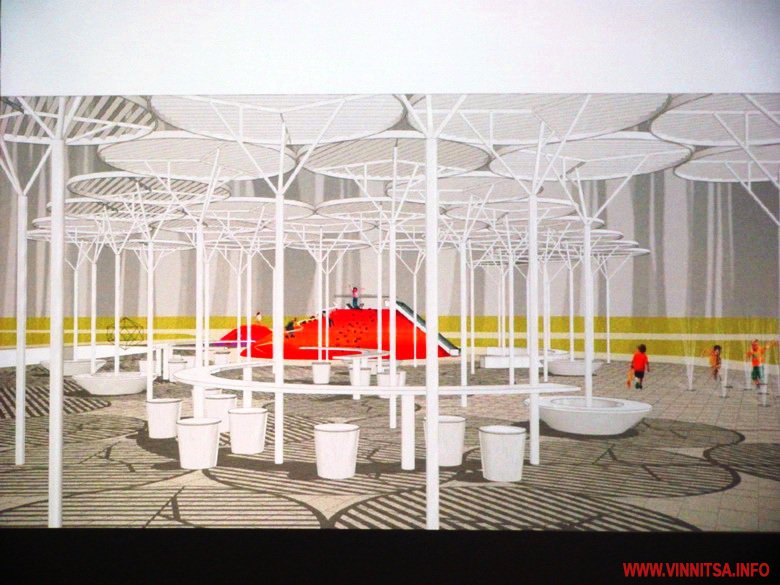Команда вінничан (Ольга Білоус, Роман Вікулов та Любов Колосова) запропонувала переосмислити план парку, поділивши на окремі локації за допомогою кущів різної висоти й виду.
