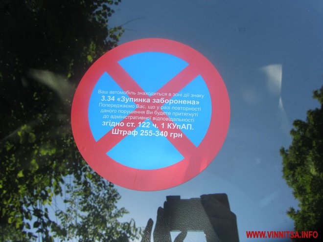 «Ваш автомобіль знаходиться в зоні дії знаку 3.34 «Зупинка заборонена». Попереджуємо Вас, що у разі повторності даного правопорушення, Ви будете притягнуті до адміністративної відповідальності згідно ст. 122, ч.1 КУпАП. Штраф – 255-340 гривень», - йшлося у наклейках.