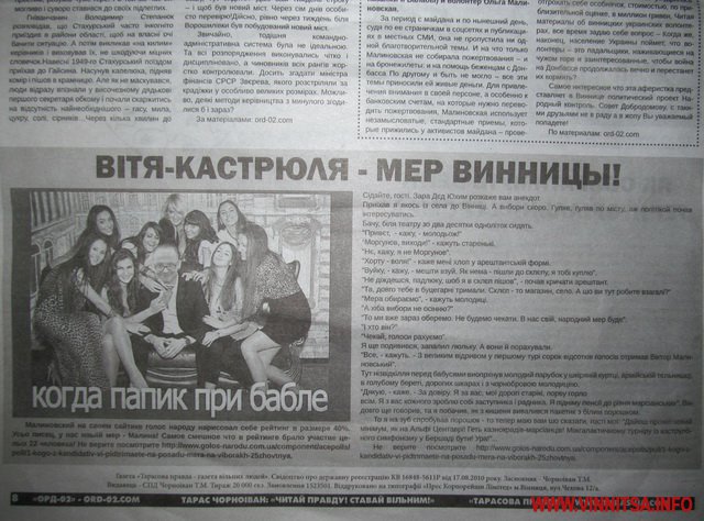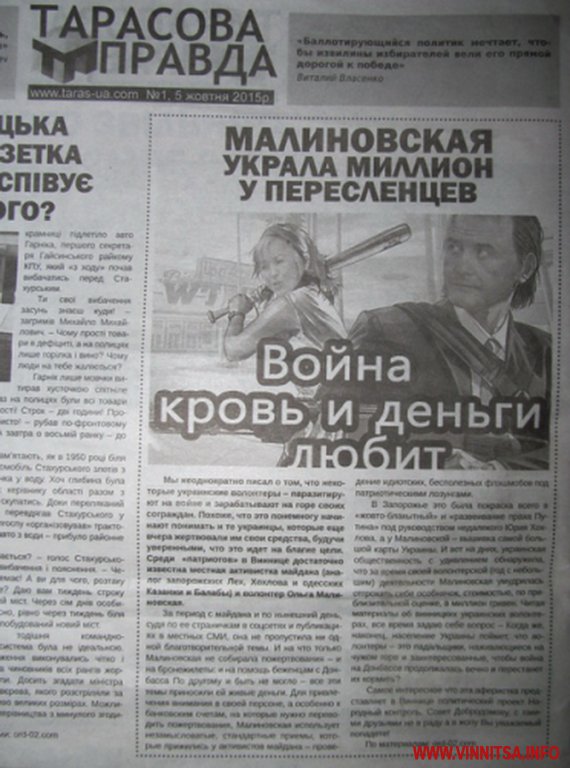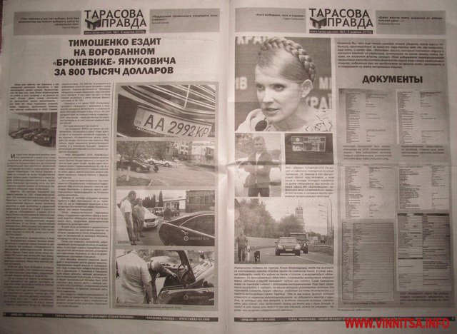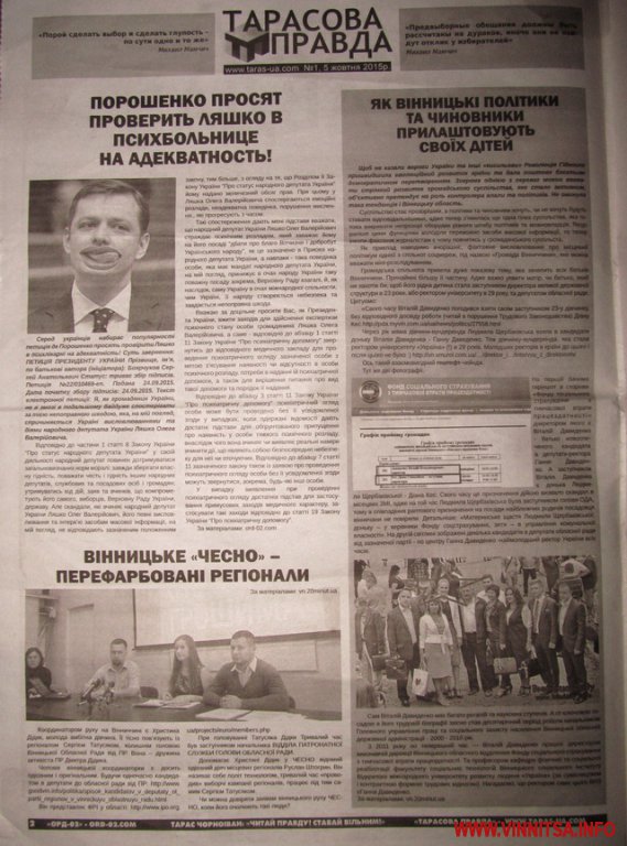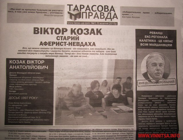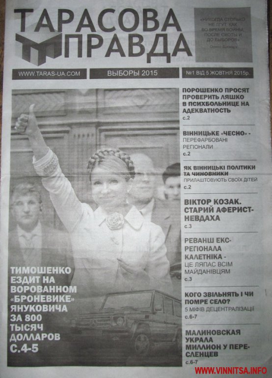Негативні й образливі відомості про місцевих кандидатів та українських політиків містить газета «Тарасова правда», що розповсюджується у Вінниці.