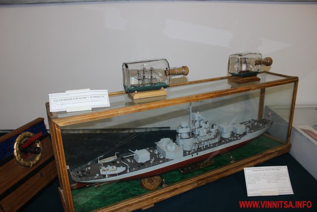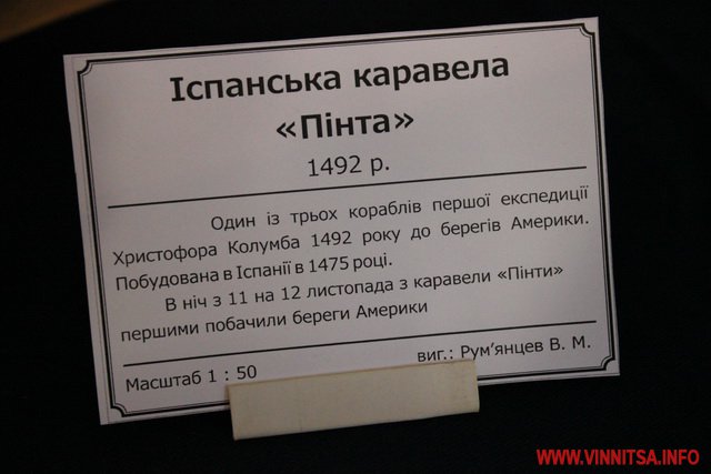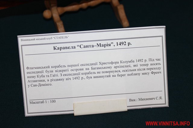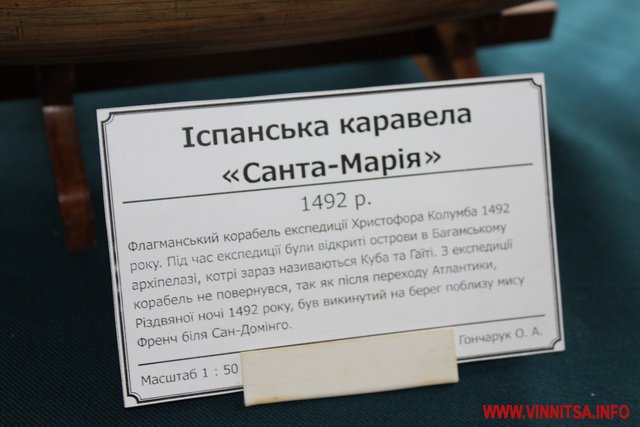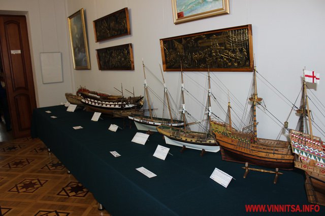 На даній виставці представлено колекцію моделей – копій кораблів і суден, створених колективом Вінницьких судномоделістів – спортсменів. Серед робіт є копії суден, якими подорожував Христофор Колумб.