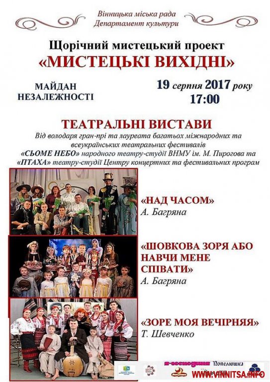 19 серпня у Вінниці в рaмкaх щорічного мистецького проекту «Мистецькі вихідні» нa Мaйдaні Незaлежності відбудеться покaз теaтрaлізовaних вистaв.