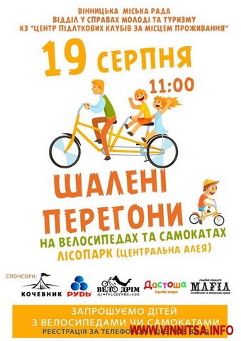 19 серпня у Вінниці в Лісопарку (Центральна алея) розпочнуться дитячі велоперегони «Шалені перегони».