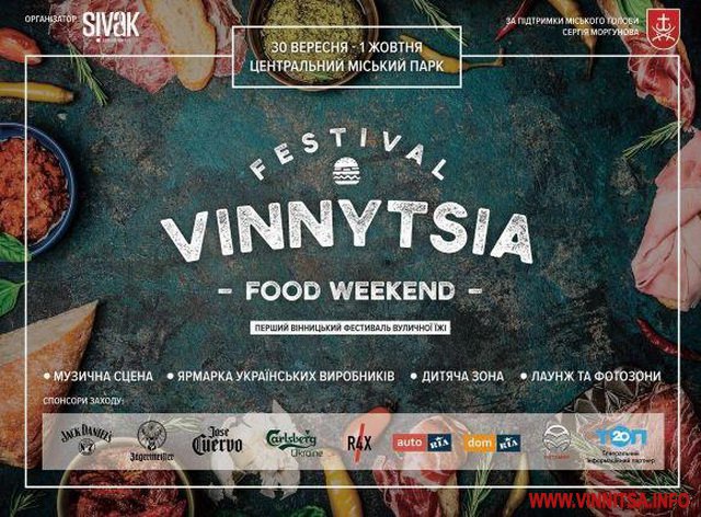 30 вересня і 1 жовтня Вінниця проведе перший фестиваль вуличної їжі. «Vinnytsia food weekend» розгорнеться у Центральному парку біля Літнього театру. Дводенний фест збере учасників з усієї країни. Для городян та гостей міста підготують близько 60 локацій.