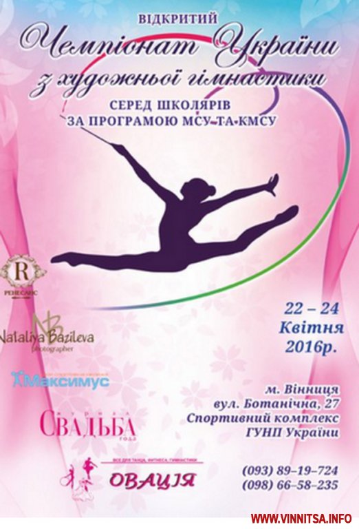 У Вінниці з 21 по 24 квітня у приміщенні спортивного комплексу державної поліції проходитиме чемпіонат України з художньої гімнастики серед школярів за програмою майстрів спорту та кандидатів.