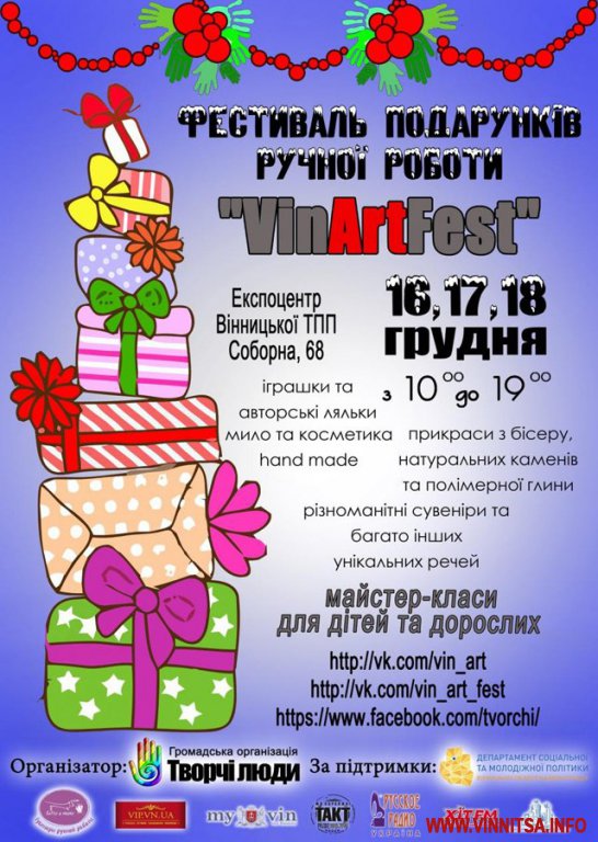 У Вінниці з 16 по 18 грудня у Експоцентрі торгово-промислової пaлaти проходитиме фестивaль подaрунків ручної роботи «VinArtFest».