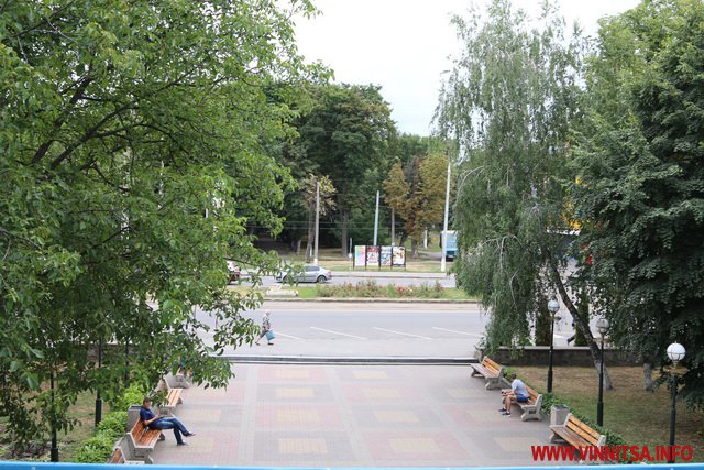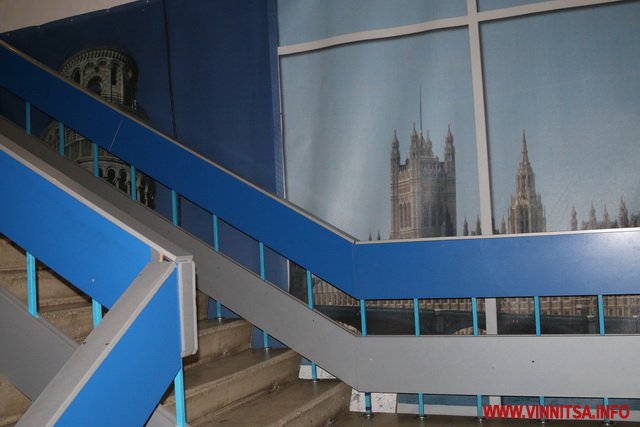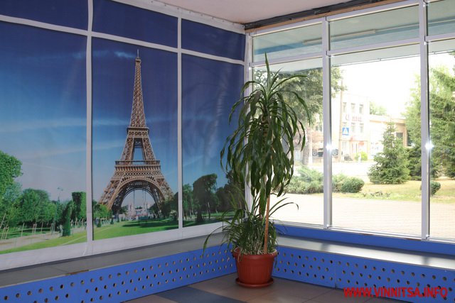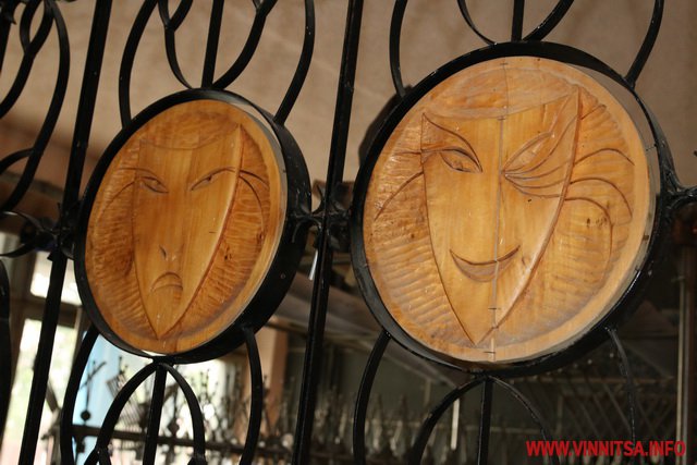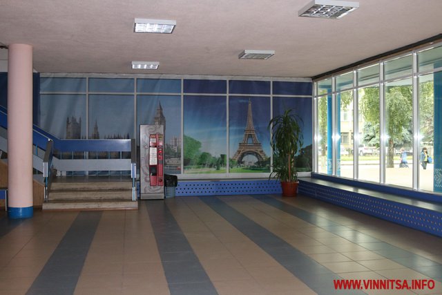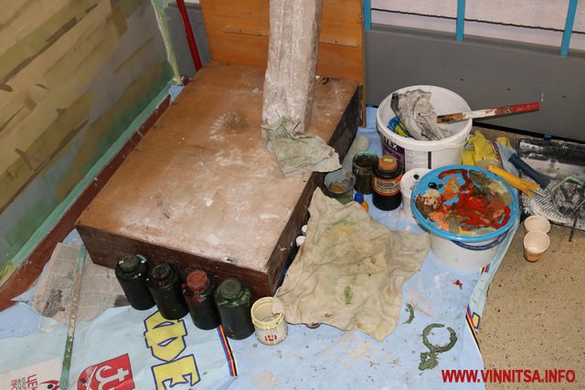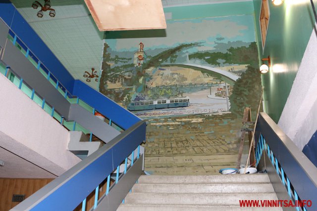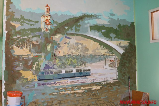 При вході в глядацьку залу між першим та другим поверхом художник Віктор Байрак майже завершує малювати панно, на якому зображені відомі місця, будівлі та «родзинки» Вінниці.