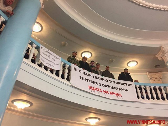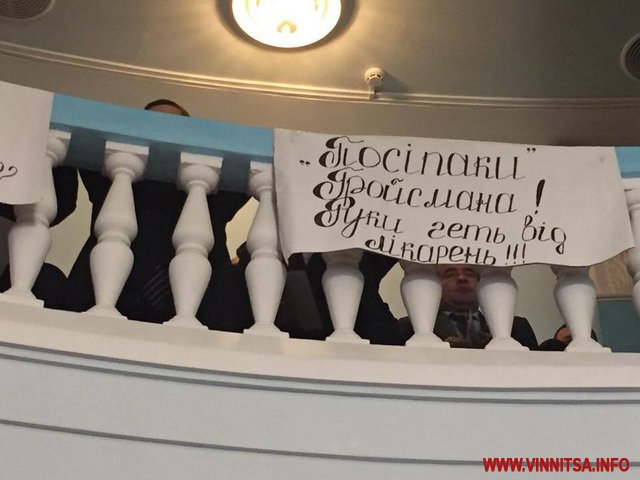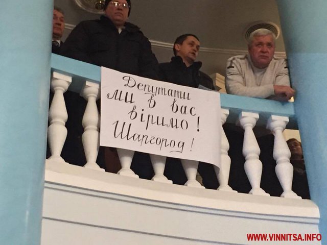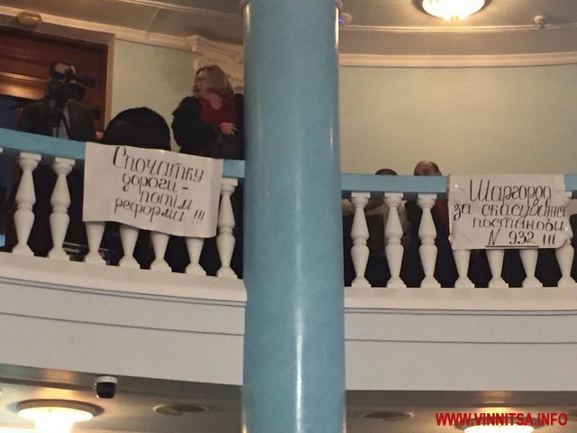 «Самопоміч» прийшла до сесійної зали з представниками громади, які підготували плакати, з написом: «бізнес на крові», представники районів вийшли з плакатами: «реформи як геноцид нації».