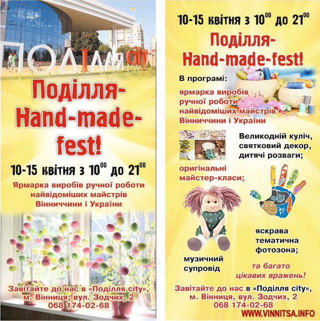 10 квітня у Вінниці розпочав роботу ярмарок Hand-made. З 10 до 21 години городяни та гості міста зможуть відвідати майстер-класи, придбати сувеніри і зробити веселі фото. Місце проведення – ТЦ «Поділля City».