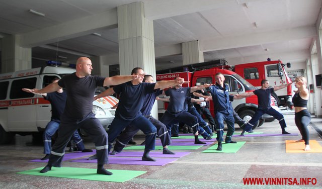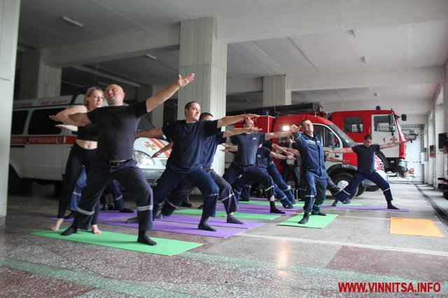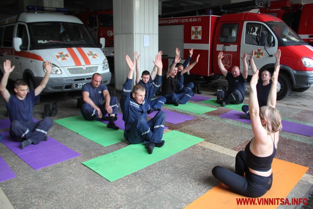 З 8 червня у Вінниці стартував соціальний проект для рятувальників частини по вул. 600-річчя. Сюди прибув інструктор з йоги. У вільному просторі між спецмашинами розклали карімати. Тренер Оксана Бєсєдіна розпочала навчання з легкої медитації.