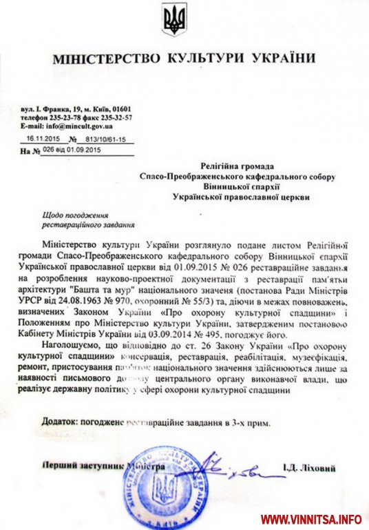16 листопада Міністерство культури України надало погодження реставраційного завдання на проведення науково-проектних робіт для виконання першочергових протиаварійних та консерваційних робіт на пам'ятці архітектури національного значення «Башта та мур». Дозвіл надано релігійній громаді Спасо-Преображенського кафедрального Собору Вінницької єпархії Української православної церкви, на балансі якої перебуває пам’ятка архітектури.