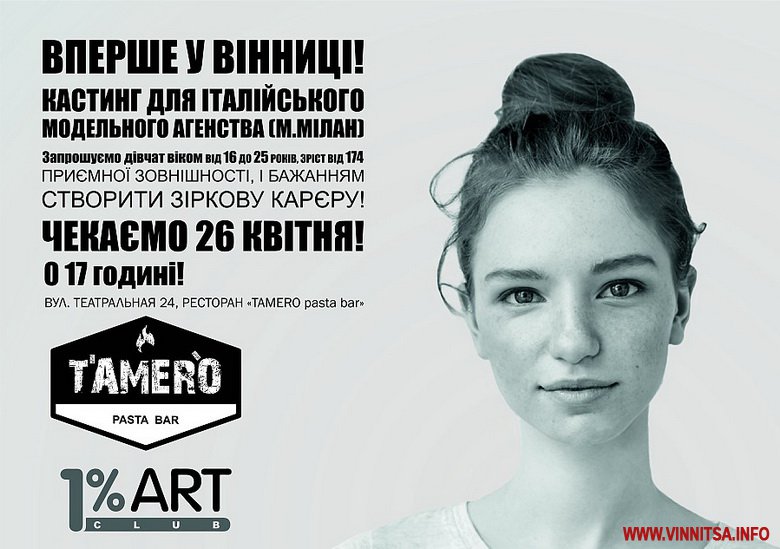 Кастинг відбудеться о 17 годині в ресторані «TAMERO pasta bar», за адресою м. Вінниця, вул. Театральна, 24. Для участі, необхідно попередньо зареєструватись, за телефоном – 8(067)4108999.