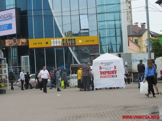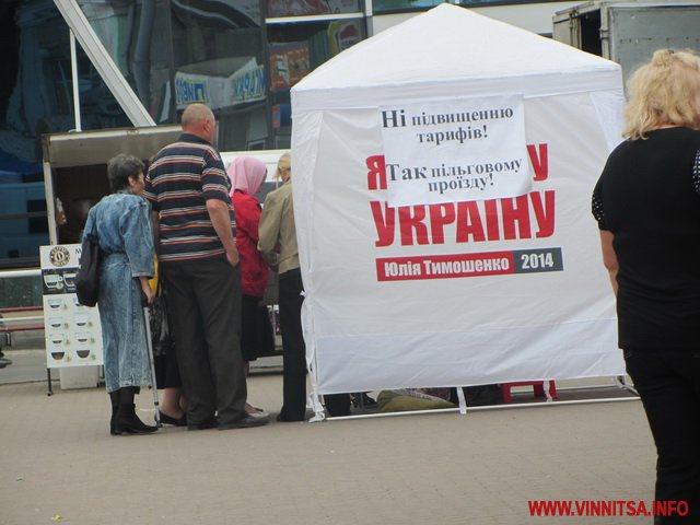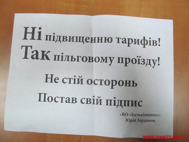 Вінничанам, які проходять повз намет роздають листівки з написом: «Ні підвищенню тарифів! Так пільговому проїзду! Не стій осторонь, постав свій підпис», які «підписані» керівником Вінницької міської організації «ВО Батьківщина» Юрієм Іордановим.