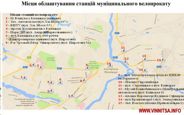 Адреси, за якими запланували розмістити станції муніципального велопрокату: