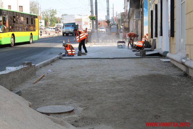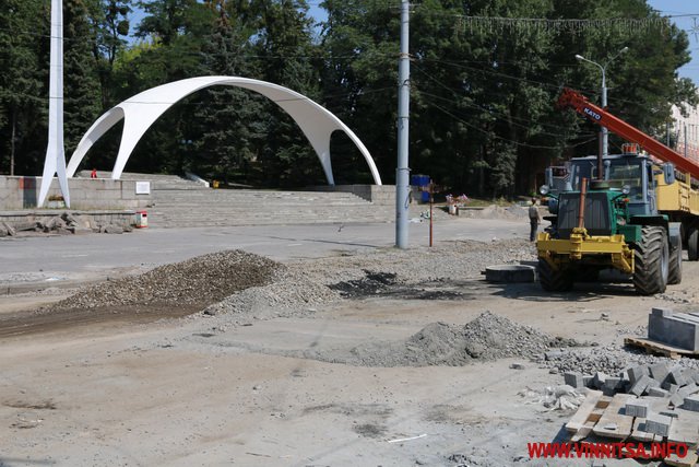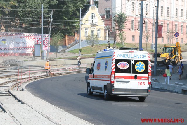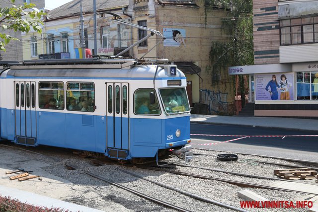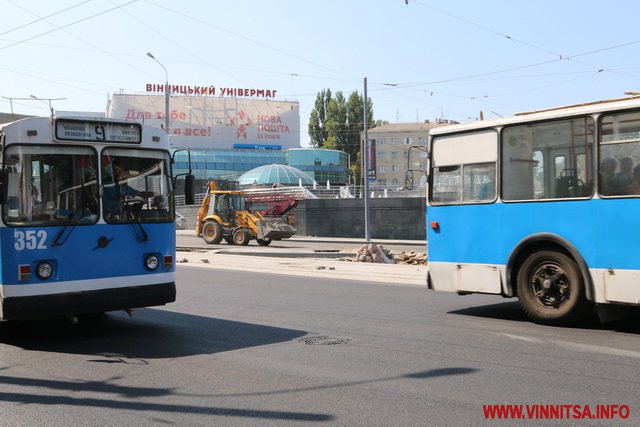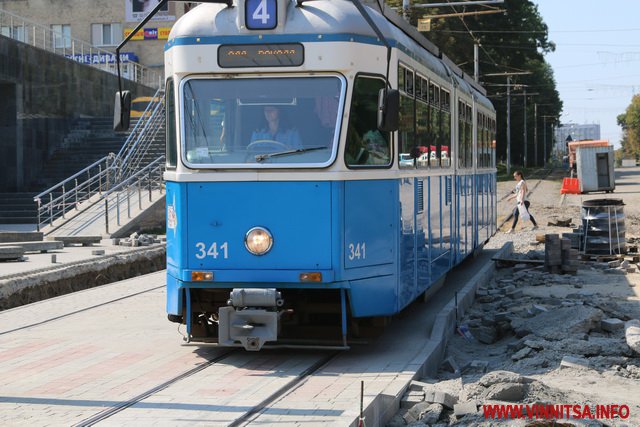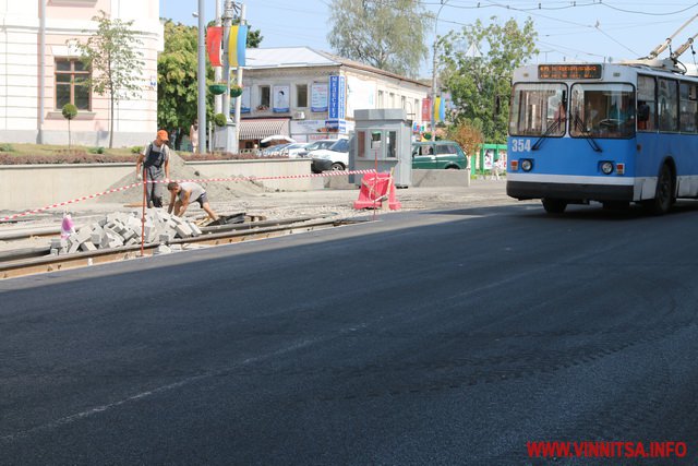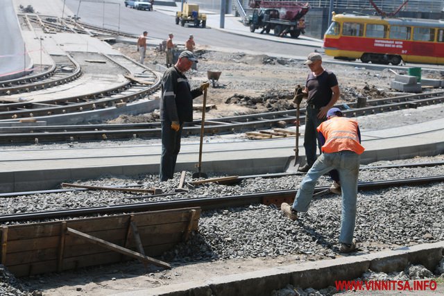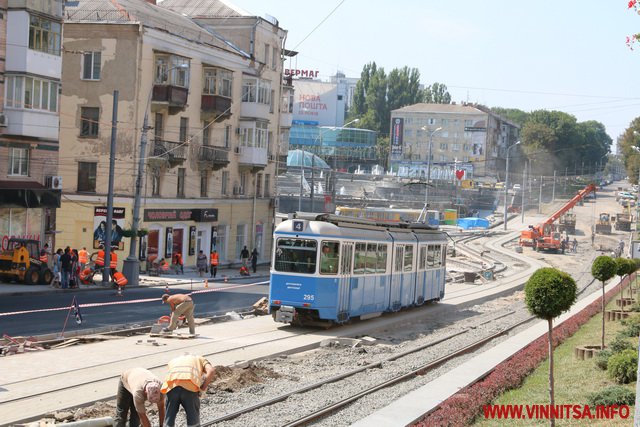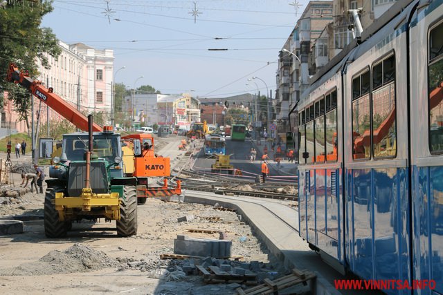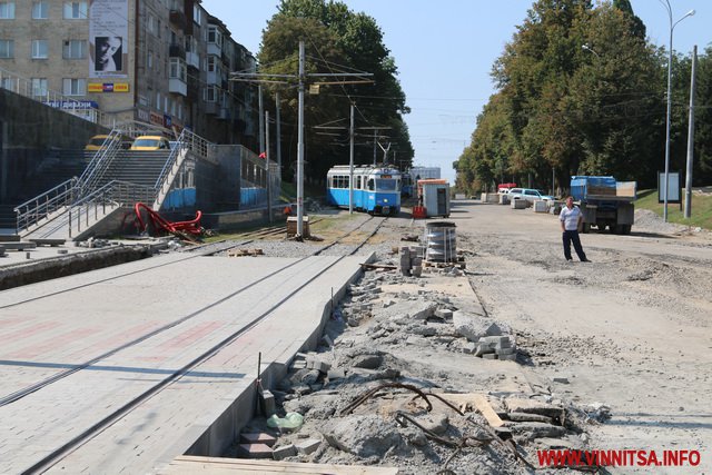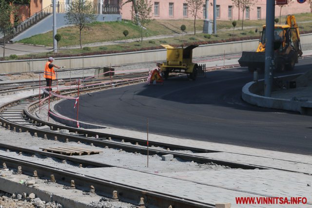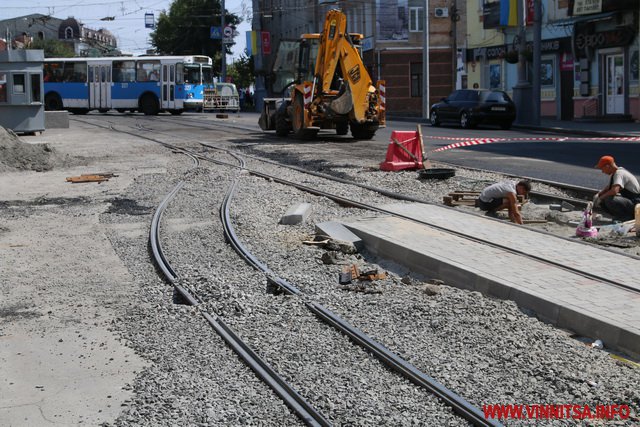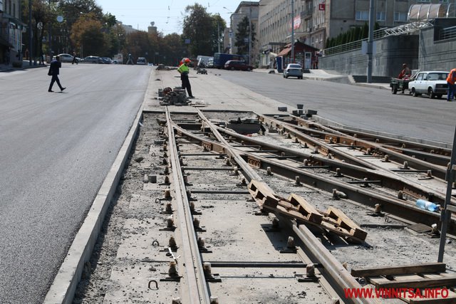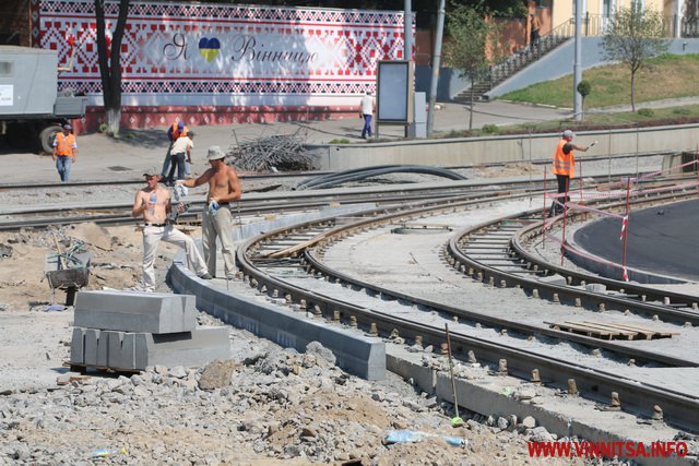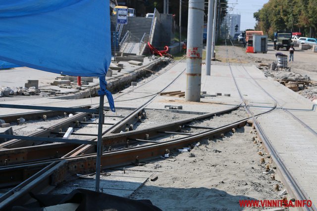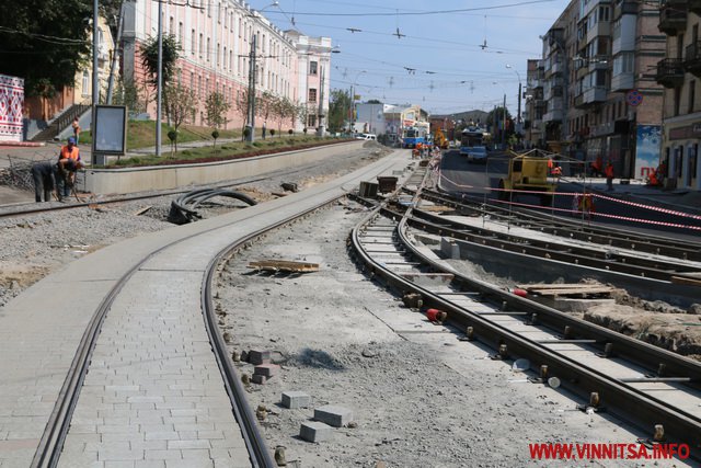 Нова трамвайна колія змонтована поки що в одному напрямку. Трамваї що рухаються від залізничного вокзалу та з Барського шосе проїжджають по черзі.