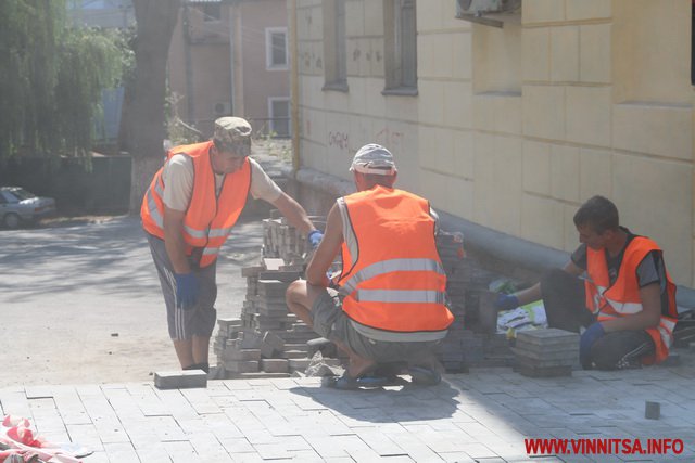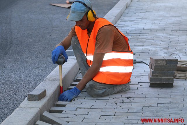По тротуарі на Соборній будівельники продовжують стелити нову тротуарну плитку від площі Гагаріна до вулиці Хлібної.