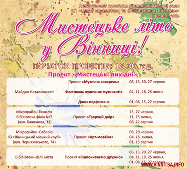 Щосуботи, з 6 червня по 29 серпня кожен вінничан зможе долучитися до інтерактивного проекту «Мистецькі вихідні». У його рамках на різних майданчиках міста відбуватимуться яскраві та цікаві дійства, починаючи з інтелектуальних, розважальних ігор, майстер-класів і закінчуючи концертними програмами.