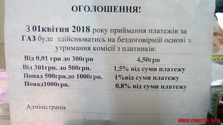 З 1 квітня запровадили комісію на сплату комунальних платежів за спожитий газ. Відповідне оголошення розмістили на касах вінницького відділення «Укрпошти» по вулиці Соборній.