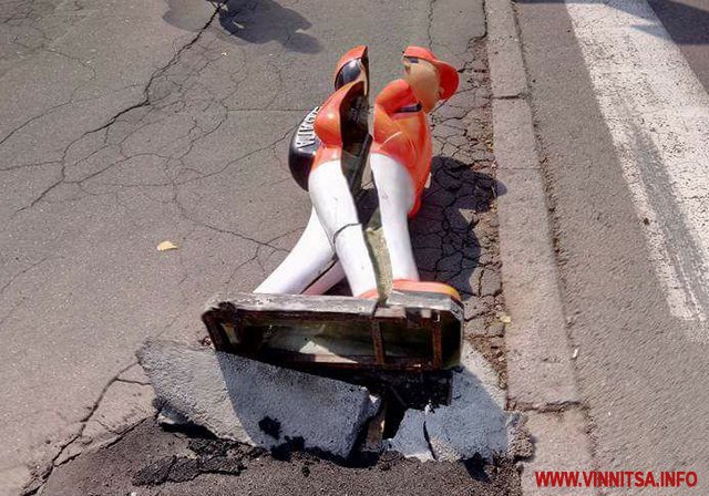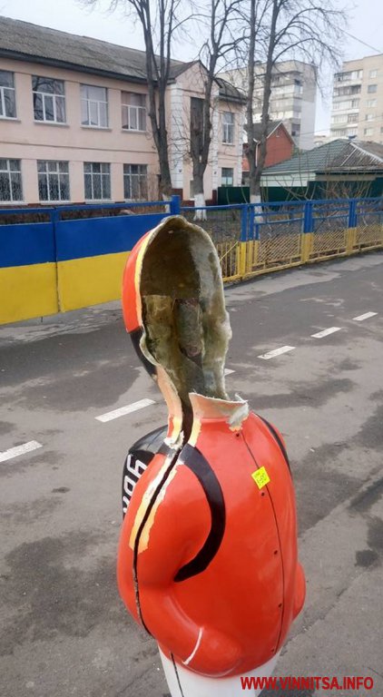 У Вінниці на вулиці Володимира Винниченка пошкодили помаранчевого «хлопчика», розтрощивши голову. Фігурка стояла зі сторони школи №8, перед пішохідним переходом.