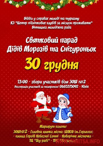 30 грудня у Вінниці відбудеться святковий парад Дідів Морозів та Снігуроньок. До якого можуть долучитися всі охочі.