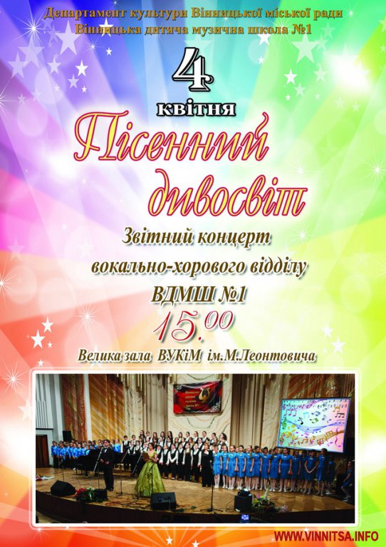 4 квітня у Вінниці відбудеться звітний вокально-хоровий концерт «Пісенний дивосвіт» вінницької дитячої музичної школи № 1.